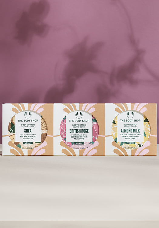Tutti i cremosi burri per il corpo di questo trio sono arricchiti con burro di karité del commercio equo e solidale del Ghana, prodotto artigianalmente, per un'idratazione che si ripete ogni volta. Ognuno di essi amerà, lenirà e nutrirà intensamente la pelle come mai prima d'ora, lasciandola più liscia e morbida.